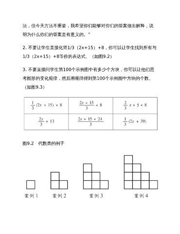 法,但今天方法不重要,我希望你们能够对你们的答案做出解释,说 明为什么你们的答案是有意义的。” 2. 不要让学生直接化简1/3(2x+15)+8,你可以让学生找到所有与 1/3(2x+15)+8等价的表达式。(如图9.2) 3. 不要直接问学生第100个示例图中有多少个方块,你可以让他们思 考图形的变化规律,然后用规律得到第100个示例图中方块的个数。 (如图9.3) 图9.2 代数类的例子