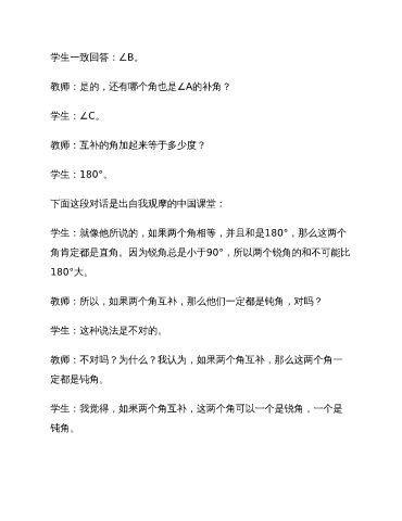 教师:所以,如果两个角互补,那么他们一定都是钝角,对吗?