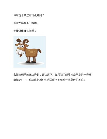 你对这个场景有什么疑问? 为这个场景画一幅图。 你能提出哪些问题? 太阳在棚子的东边升起,西边落下。如果我们能够为山羊提供一些树 荫就更好了。你应该把树种在哪里呢?你想种什么品种的树呢?