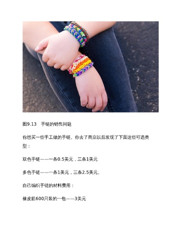 图9.13 手链的销售问题 你想买一些手工做的手链。你去了商店以后发现了下面这些可选类 型: 双色手链——一条0.5美元,三条1美元 多色手链——一条1美元,三条2.5美元。 自己编织手链的材料费用: 橡皮筋600只装的一包——3美元