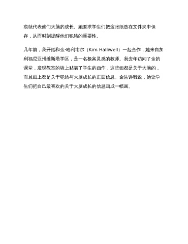 痕就代表他们大脑的成长。她要求学生们把这张纸放在文件夹中保 存,从而时刻提醒他们犯错的重要性。 几年前,我开始和金·哈利韦尔(Kim Halliwell)一起合作,她来自加 利福尼亚州维斯塔学区,是一名极富灵感的教师。我去年访问了金的 课堂,发现教室的墙上贴满了学生的画作,这些画都是关于大脑的, 而且画上都是关于犯错与大脑成长的正面信息。金告诉我说,她让学 生们把自己最喜欢的关于大脑成长的信息画成一幅画。