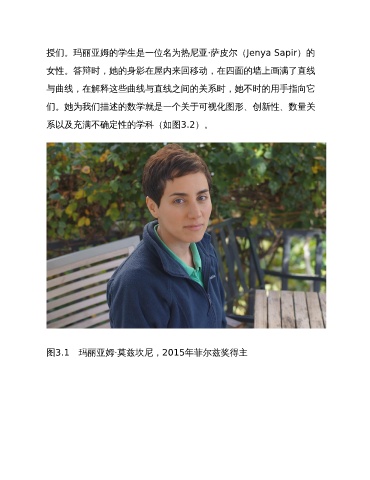 授们。玛丽亚姆的学生是一位名为热尼亚·萨皮尔(Jenya Sapir)的 女性。答辩时,她的身影在屋内来回移动,在四面的墙上画满了直线 与曲线,在解释这些曲线与直线之间的关系时,她不时的用手指向它 们。她为我们描述的数学就是一个关于可视化图形、创新性、数量关 系以及充满不确定性的学科(如图3.2)。 图3.1 玛丽亚姆·莫兹坎尼,2015年菲尔兹奖得主