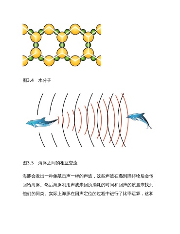 图3.4 水分子 图3.5 海豚之间的相互交流 海豚会发出一种像敲击声一样的声波,这些声波在遇到障碍物后会传 回给海豚。然后海豚利用声波来回所消耗的时间和回声的质量来找到 他们的同类。实际上海豚在回声定位的过程中进行了比率运算,这和