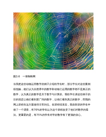 图3.6 一张蜘蛛网 当我把这些动物运用数学的例子介绍给学生时,部分学生对这些案例 很抵触,他们认为自然界中的数学和动物们运用的数学都不是真正的 数学,认为真正的数学是关于数字与计算的。我给学生讲这些例子的 目的就是让他们看到更广阔的数学,让他们看到真正的数学,而我的 网上课程在这方面做得非常到位。在课程结束后,我在听课的学生中 做了一个调查,有70%的学生认为这个课程改变了他们对数学的看 法。更重要的是,有75%的学生对学好数学有了更强的信心。