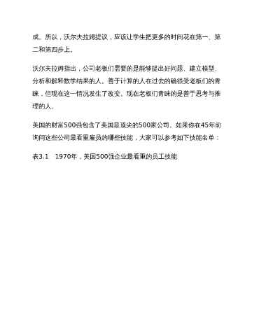 成。所以,沃尔夫拉姆提议,应该让学生把更多的时间花在第一、第 二和第四步上。 沃尔夫拉姆指出,公司老板们需要的是能够提出好问题、建立模型、 分析和解释数学结果的人。善于计算的人在过去的确很受老板们的青 睐,但现在这一情况发生了改变。现在老板们青睐的是善于思考与推 理的人。 美国的财富500强包含了美国最顶尖的500家公司。如果你在45年前 询问这些公司最看重雇员的哪些技能,大家可以参考如下技能名单: 表3.1 1970年,美国500强企业最看重的员工技能
