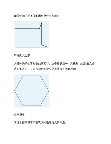 如果你问学生下面的图形是什么形状: 不规则六边形 大部分的学生不知该如何回答。这个形状是一个六边形(就是有六条 边的多边形),但六边形的定义总是通过下图来表示: 正六边形 而这个图形根本不能说明六边形定义的本质。