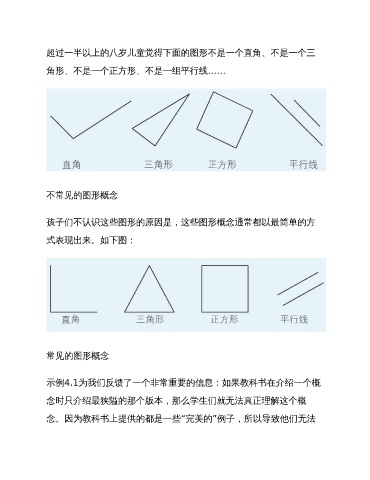超过一半以上的八岁儿童觉得下面的图形不是一个直角、不是一个三 角形、不是一个正方形、不是一组平行线…… 不常见的图形概念 孩子们不认识这些图形的原因是,这些图形概念通常都以最简单的方 式表现出来。如下图: 常见的图形概念 示例4.1为我们反馈了一个非常重要的信息:如果教科书在介绍一个概 念时只介绍最狭隘的那个版本,那么学生们就无法真正理解这个概 念。因为教科书上提供的都是一些“完美的”例子,所以导致他们无法