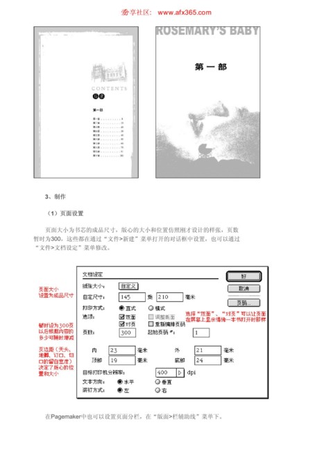 设计精装书 ιٳཚഠ XXX BGY DPN 页码,3/31 3、制作 (1)页面设置 页面大小为书芯的成品尺寸,版心的大小和位置仿照刚才设计的样张,页数 暂时为300,这些都在通过“文件>新建”菜单打开的对话框中设置,也可以通过 “文件>文档设定”菜单修改。 在Pagemaker中也可以设置页面分栏,在“版面>栏辅助线”菜单下。 https://www.antssoft.com/14-7.htm 2009-5-9