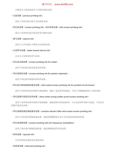 ·网孔版油墨(screen printing ink)或丝网版油墨(silk screen printing ink)