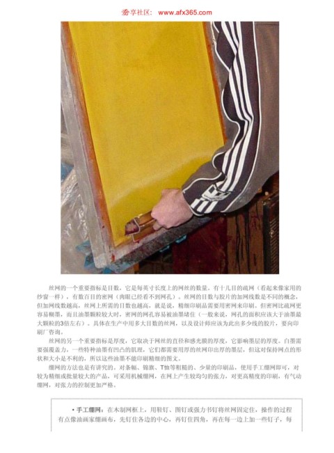 ·手工绷网:在木制网框上,用鞋钉、图钉或强力书钉将丝网固定住,操作的过程