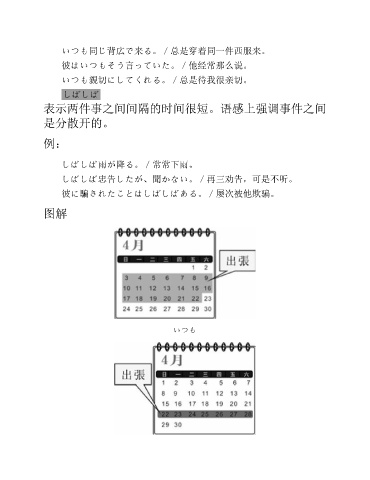 いつも同じ背広で来る。/总是穿着同一件西服来。 彼はいつもそう言っていた。/他经常那么说。 いつも親切にしてくれる。/总是待我很亲切。 しばしば 表示两件事之间间隔的时间很短。语感上强调事件之间 是分散开的。 例: しばしば雨が降る。/常常下雨。 しばしば忠告したが、聞かない。/再三劝告,可是不听。 彼に騙されたことはしばしばある。/屡次被他欺骗。 图解 いつも