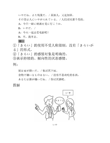 いやだね。また残業だ。/真烦人,又是加班。 その男は人にいやがられている。/人们讨厌那个男的。 A:今日一緒に映画を見に行こうか。 B:いやだ。/ A:今天一起去看电影吧! B:不,我不去。 嫌い ①「きらい」的使用不受人称限制,没有「きらいが る」的形式。 ②「きらい」的感情对象是明确的。 ③表示持续的、倾向性的厌恶感情。 例: 彼は雨が嫌いだ。/他讨厌下雨。 食物で嫌いなものはない。/没有不喜欢吃的东西。 あなたは猫が嫌いだね。/你讨厌猫吧。 图解 いや