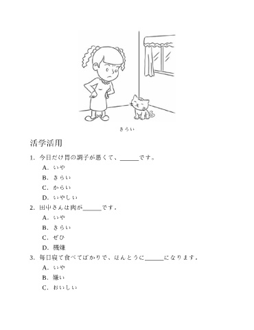 きらい 活学活用 1.今日だけ胃の調子が悪くて、______です。 A.いや B.きらい C.からい D.いやしい 2.田中さんは肉が______です。 A.いや B.きらい C.ぜひ D.機嫌 3.毎日寝て食べてばかりで、ほんとうに______になります。 A.いや B.嫌い C.おいしい