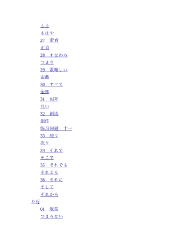 もう もはや 27 素直 正直 28 すなわち つまり 29 素晴しい 素敵 30 すべて 全部 31 相互 互い 32 創造 創作 练习问题 十一 33 続々 次々 34 それで そこで 35 それでも それとも 36 それに そして それから た行 01 退屈 つまらない