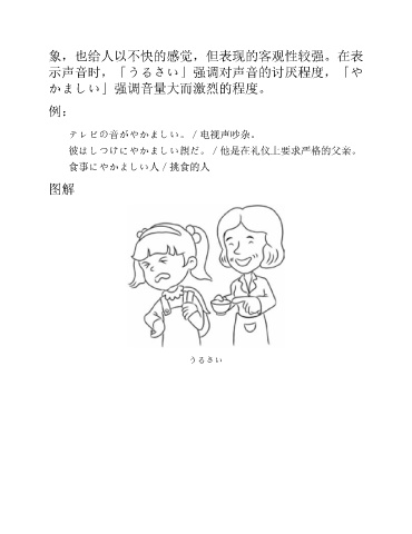 象,也给人以不快的感觉,但表现的客观性较强。在表 示声音时,「うるさい」强调对声音的讨厌程度,「や かましい」强调音量大而激烈的程度。 例: テレビの音がやかましい。/电视声吵杂。 彼はしつけにやかましい親だ。/他是在礼仪上要求严格的父亲。 食事にやかましい人/挑食的人 图解 うるさい