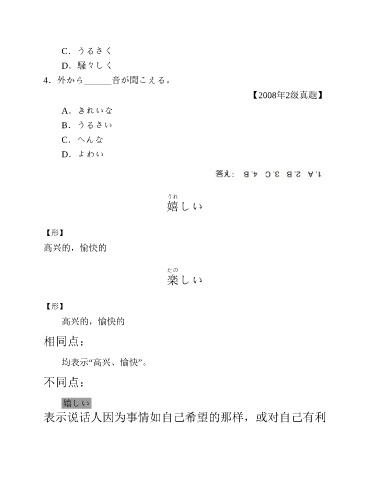 C.うるさく D.騒々しく 4.外から______音が聞こえる。 【2008年2级真题】 A.きれいな B.うるさい C.へんな D.よわい うれ 嬉しい 【形】 高兴的,愉快的 たの 楽しい 【形】 高兴的,愉快的 相同点: 均表示“高兴、愉快”。 不同点: 嬉しい 表示说话人因为事情如自己希望的那样,或对自己有利