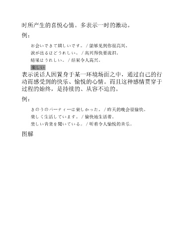 时所产生的喜悦心情。多表示一时的激动。 例: お会いできて嬉しいです。/能够见到你很高兴。 涙が出るほどうれしい。/高兴得快要流泪。 結果はうれしい。/结果令人高兴。 楽しい 表示说话人因置身于某一环境场面之中,通过自己的行 动而感受到的快乐、愉悦的心情。而且这种感情贯穿于 过程的始终,是持续的、从容不迫的。 例: きのうのパーティーは楽しかった。/昨天的晚会很愉快。 楽しく生活しています。/愉快地生活着。 楽しい音楽を聞いている。/听着令人愉悦的音乐。 图解