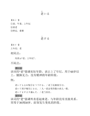 お 老いる 【自上一】 ①老,年老,上年纪 ②衰老 ③将近,垂暮 ふ 老ける 【自下一】 上年纪,老 相同点: 均表示“老、上年纪”。 不同点: 老いる 该词的“老”强调实际年龄,表示上了年纪。用于60岁以 上,腿脚无力,没有精神的年龄阶段。 例: 老いてもなお勉学をつづける。/老了还继续学习。 老いて再び稚児になる。/人一老会变得像小孩儿一般。 老いてますます盛んだ。/老当益壮。 老ける 该词的“老”强调外表看起来老,与年龄没有直接关系。 常用于30到50岁,面容发生变化的阶段。