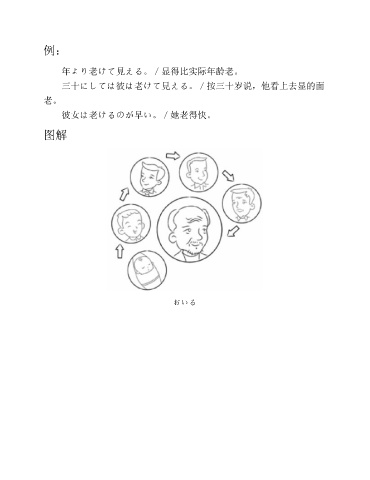 例: 年より老けて見える。/显得比实际年龄老。 三十にしては彼は老けて見える。/按三十岁说,他看上去显的面 老。 彼女は老けるのが早い。/她老得快。 图解 おいる