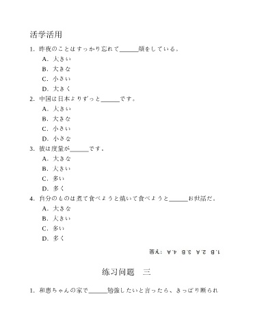 活学活用 1.昨夜のことはすっかり忘れて______顔をしている。 A.大きい B.大きな C.小さい D.大きく 2.中国は日本よりずっと______です。 A.大きい B.大きな C.小さい D.小さな 3.彼は度量が______です。 A.大きな B.大きい C.多い D.多く 4.自分のものは煮て食べようと焼いて食べようと______お世話だ。 A.大きな B.大きい C.多い D.多く 练习问题 三 1.和恵ちゃんの家で______勉強したいと言ったら、きっぱり断られ