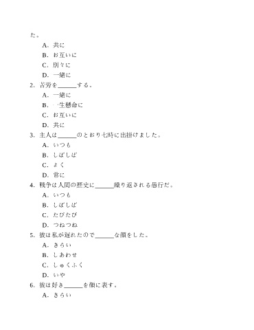 た。 A.共に B.お互いに C.別々に D.一緒に 2.苦労を______する。 A.一緒に B.一生懸命に C.お互いに D.共に 3.主人は______のとおり七時に出掛けました。 A.いつも B.しばしば C.よく D.常に 4.戦争は人間の歴史に______繰り返される愚行だ。 A.いつも B.しばしば C.たびたび D.つねつね 5.彼は私が遅れたので______な顔をした。 A.きらい B.しあわせ C.しゅくふく D.いや 6.彼は好き______を顔に表す。 A.きらい