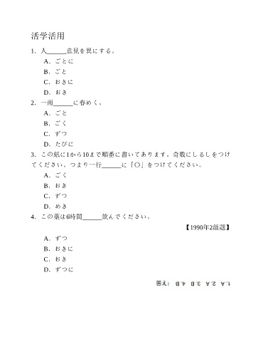 活学活用 1.人______意見を異にする。 A.ごとに B.ごと C.おきに D.おき 2.一雨______に春めく。 A.ごと B.ごく C.ずつ D.たびに 3.この紙に1から10まで順番に書いてあります。奇数にしるしをつけ てください。つまり一行______に「〇」をつけてください。 A.ごく B.おき C.ずつ D.めき 4.この薬は6時間______飲んでください。 【1990年2级题】 A.ずつ B.おきに C.おき D.ずつに