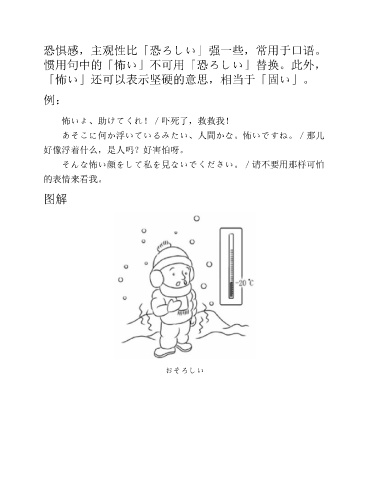 恐惧感,主观性比「恐ろしい」强一些,常用于口语。 惯用句中的「怖い」不可用「恐ろしい」替换。此外, 「怖い」还可以表示坚硬的意思,相当于「固い」。 例: 怖いよ、助けてくれ!/吓死了,救救我! あそこに何か浮いているみたい、人間かな。怖いですね。/那儿 好像浮着什么,是人吗?好害怕呀。 そんな怖い顔をして私を見ないでください。/请不要用那样可怕 的表情来看我。 图解 おそろしい