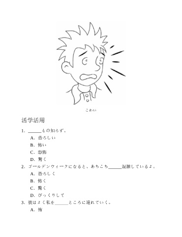 こわい 活学活用 1.______もの知らず。 A.恐ろしい B.怖い C.恐怖 D.驚く 2.ゴールデンウィークになると、あちこち______混雑しているよ。 A.恐ろしく B.怖く C.驚く D.びっくりして 3.彼はよく私を______ところに連れていく。 A.怖