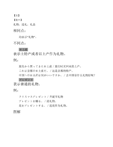 【名】 【他サ】 礼物,送礼,礼品 相同点: 均表示“礼物”。 不同点: お土産 表示土特产或者以土产作为礼物。 例: 旅先から買ってきたお土産/旅行时买回来的土产。 これは京都のお土産だ。/这是京都的特产。 中国へのお土産は何がいいですか。/去中国带什么礼物好呢? プレゼント 表示普通的礼物。 例: クリスマスプレゼント/圣诞节礼物 プレゼントを贈る。/送礼物。 花をプレゼントする。/送花作为礼物。 图解