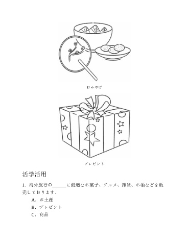 おみやげ プレゼント 活学活用 1.海外旅行の______に最適なお菓子、グルメ、雑貨、お酒などを販 売しております。 A.お土産 B.プレゼント C.商品
