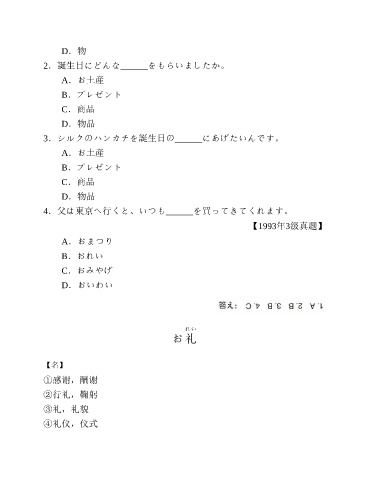 D.物 2.誕生日にどんな______をもらいましたか。 A.お土産 B.プレゼント C.商品 D.物品 3.シルクのハンカチを誕生日の______にあげたいんです。 A.お土産 B.プレゼント C.商品 D.物品 4.父は東京へ行くと、いつも______を買ってきてくれます。 【1993年3级真题】 A.おまつり B.おれい C.おみやげ D.おいわい れい お礼 【名】 ①感谢,酬谢 ②行礼,鞠躬 ③礼,礼貌 ④礼仪,仪式