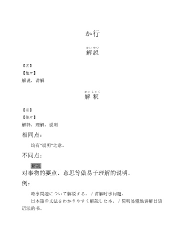 か行 かい せつ 解 説 【名】 【他サ】 解说,讲解 かい しゃく 解 釈 【名】 【他サ】 解释,理解,说明 相同点: 均有“说明”之意。 不同点: 解説 对事物的要点、意思等做易于理解的说明。 例: 時事問題について解説する。/讲解时事问题。 日本語の文法をわかりやすく解説した本。/简明易懂地讲解日语 语法的书。