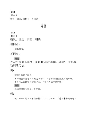 【名】 【他サ】 坚信、确信、有信心、有把握 かく にん 確 認 【名】 【他サ】 确认、证实、判明、明确 相同点: 词形相似。 不同点: 確実 表示事情的真实性。可以翻译成“准确、确实”,有形容 动词的用法。 例: 確実な診断/确诊 あの雑誌は発行日が確実でない。/那部杂志的出版日期不准。 あの二人は確実に結婚する。/那二人确实要结婚。 確信 表示对事情有信心、有把握。 例: 彼は未来に対する確信を持つようになった。/他对未来渐渐有了