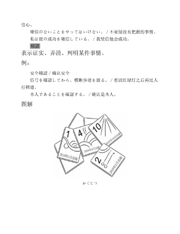 信心。 確信のないことをやってはいけない。/不要做没有把握的事情。 私は彼の成功を確信している。/我坚信他会成功。 確認 表示证实、弄清、判明某件事情。 例: 安全確認/确认安全 信号を確認してから、横断歩道を渡る。/看清红绿灯之后再过人 行横道。 本人であることを確認する。/确认是本人。 图解 かくじつ