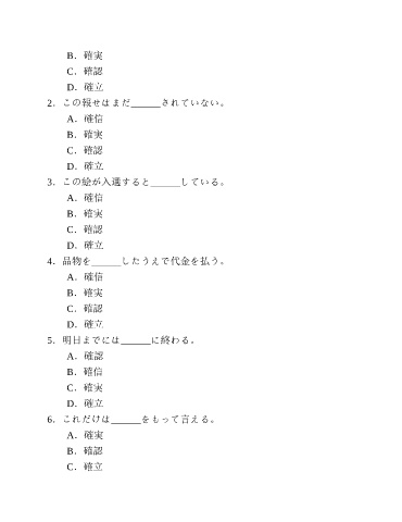 B.確実 C.確認 D.確立 2.この報せはまだ______されていない。 A.確信 B.確実 C.確認 D.確立 3.この絵が入選すると______している。 A.確信 B.確実 C.確認 D.確立 4.品物を______したうえで代金を払う。 A.確信 B.確実 C.確認 D.確立 5.明日までには______に終わる。 A.確認 B.確信 C.確実 D.確立 6.これだけは______をもって言える。 A.確実 B.確認 C.確立