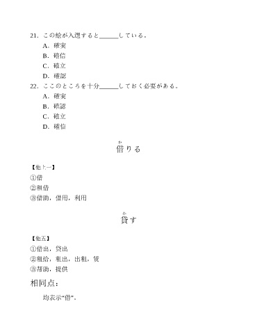 21.この絵が入選すると______している。 A.確実 B.確信 C.確立 D.確認 22.ここのところを十分______しておく必要がある。 A.確実 B.確認 C.確立 D.確信 か 借りる 【他上一】 ①借 ②租借 ③借助,借用,利用 か 貸す 【他五】 ①借出,贷出 ②租给,租出,出租,赁 ③帮助,提供 相同点: 均表示“借”。