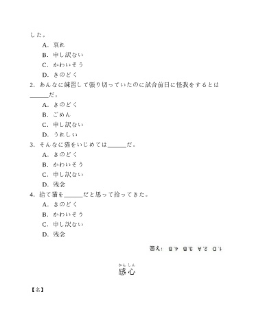 した。 A.哀れ B.申し訳ない C.かわいそう D.きのどく 2.あんなに練習して張り切っていたのに試合前日に怪我をするとは ______だ。 A.きのどく B.ごめん C.申し訳ない D.うれしい 3.そんなに猫をいじめては______だ。 A.きのどく B.かわいそう C.申し訳ない D.残念 4.捨て猫を______だと思って拾ってきた。 A.きのどく B.かわいそう C.申し訳ない D.残念 かん しん 感 心 【名】