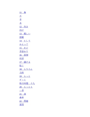 11 無 不 非 未 12 向き 向け 13 難しい 困難 14 むしろ かえって 15 めど 手掛かり 16 面倒 世話 17 儲ける 稼ぐ 18 もちろん 当然 19 もっと ずっと 练习问题 十九 20 もっとも 一番 21 森 森林 22 問題 質問