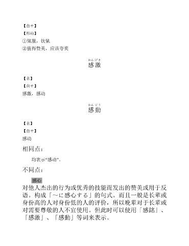 【自サ】 【形动】 ①佩服,钦佩 ②值得赞美,应该夸奖 かん げき 感 激 【名】 【自サ】 感激,感动 かん どう 感 動 【名】 【自サ】 感动 相同点: 均表示“感动”。 不同点: 感心 对他人杰出的行为或优秀的技能而发出的赞美或用于反 语。构成「~に感心する」的句式。而且一般是长辈或 身份高的人对身份低的人的评价,所以晚辈对于长辈或 对需要尊敬的人不宜使用。但此时可以使用「感銘」、 「感激」、「感動」等词来表示。