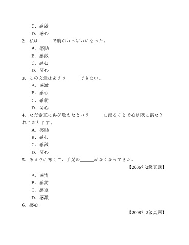 C.感激 D.感心 2.私は______で胸がいっぱいになった。 A.感動 B.感激 C.感心 D.関心 3.この文章はあまり______できない。 A.感激 B.感心 C.感動 D.関心 4.ただ素直に再び逢えたという______に浸ることで心は既に満たさ れております。 A.感動 B.感心 C.感激 D.関心 5.あまりに寒くて、手足の______がなくなってきた。 【2006年2级真题】 A.感情 B.感動 C.感覚 D.感激 6.感心 【2008年2级真题】