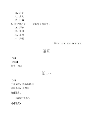 B.肝心 C.重大 D.肝臓 4.君の選択が______な影響を及ぼす。 A.肝心 B.重用 C.重大 D.肝要 かん たん 簡 単 【名】 【形动】 简单,简易 やさ 易しい 【形】 ①易懂的,容易理解的 ②简单的,易做的 相同点: 均表示“简单”。 不同点: