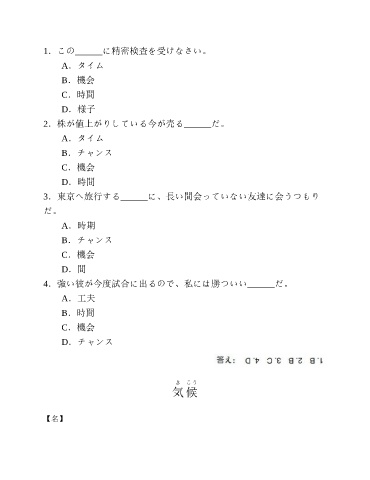 1.この______に精密検査を受けなさい。 A.タイム B.機会 C.時間 D.様子 2.株が値上がりしている今が売る______だ。 A.タイム B.チャンス C.機会 D.時間 3.東京へ旅行する______に、長い間会っていない友達に会うつもり だ。 A.時期 B.チャンス C.機会 D.間 4.強い彼が今度試合に出るので、私には勝ついい______だ。 A.工夫 B.時間 C.機会 D.チャンス き こう 気 候 【名】