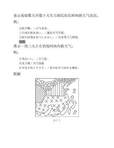表示连续数天至数十天左右的比较长时间的天气状况。 例: 天候不順。/天气反常。 この頃天候が良い。/最近天气不错。 天候の回復を待つしかない。/只有等天气转晴。 天気 表示一到三天左右的短时间内的天气。 例: 天気がいい。/天气好。 天気予報/天气预报 お天気で何よりです。/有个好天气比什么都好。 图解 きこう