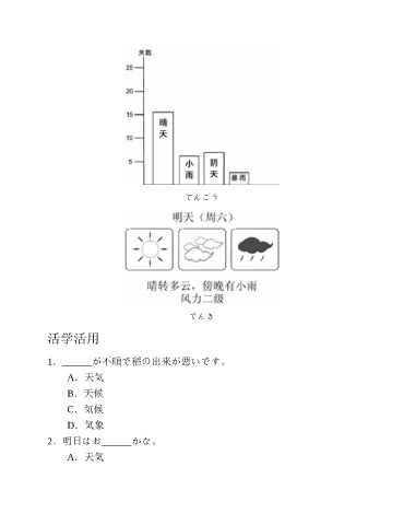 てんこう てんき 活学活用 1.______が不順で稻の出来が悪いです。 A.天気 B.天候 C.気候 D.気象 2.明日はお______かな。 A.天気