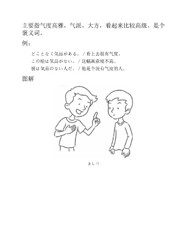 主要指气度高雅,气派、大方,看起来比较高级。是个 褒义词。 例: どことなく気品がある。/看上去很有气度。 この絵は気品がない。/这幅画意境不高。 彼は気品のない人だ。/他是个没有气度的人。 图解 きしつ