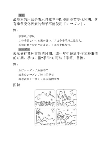 季節 最基本的用法是表示自然界中四季的季节变化时期,含 有季节变化因素的句子不能使用「シーズン」。 例: 季節風/季风 この季節はいつも風が強い。/这个季节风总是很大。 季節の移り変わりは速い。/季节变化很快。 シーズン 表示盛行某种事物的时期,或一年中最适于作某种事情 的时期、季节。指“季节”时可与「季節」替换。 例: 旅行シーズン/旅游季节 読書のシーズン/读书的季节 海水浴のシーズン/海水浴的季节 图解
