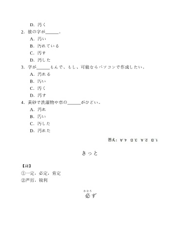 D.汚く 2.彼の字が______。 A.汚い B.汚れている C.汚す D.汚した 3.字が______もんで、もし、可能ならパソコンで作成したい。 A.汚れる B.汚い C.汚く D.汚す 4.黄砂で洗濯物や車の______がひどい。 A.汚れ B.汚い C.汚した D.汚れた きっと 【副】 ①一定,必定,肯定 ②严厉,锐利 かなら 必ず