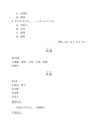 C.雰囲気 D.感覚 4.町中はお正月______にあふれている。 A.気持ち B.気分 C.感覚 D.感性 ぎ み 気 味 【接尾】 ①感触,感受,心情,心绪,情绪 ②倾向 け はい 気 配 【名】 ①情形,样子 ②动静 ③迹象 ④苗头 相同点: 均表示“有点儿……的倾向”。 不同点: