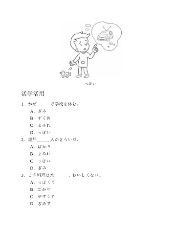 っぽい 活学活用 1.かぜ______で学校を休む。 A.ぎみ B.ずくめ C.まみれ D.っぽい 2.理屈______人がきらいだ。 A.ばかり B.まみれ C.っぽい D.ぎみ 3.この料理は水______、おいしくない。 A.っぽくて B.ばかり C.やすくて D.ぎみで