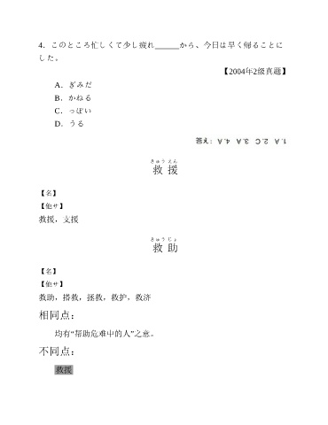 4.このところ忙しくて少し疲れ______から、今日は早く帰ることに した。 【2004年2级真题】 A.ぎみだ B.かねる C.っぽい D.うる きゅう えん 救 援 【名】 【他サ】 救援,支援 きゅう じょ 救 助 【名】 【他サ】 救助,搭救,拯救,救护,救济 相同点: 均有“帮助危难中的人”之意。 不同点: 救援